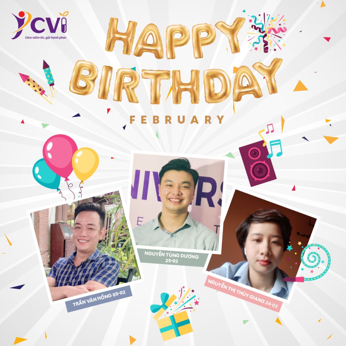 💫💫 Hi vọng những thành viên trong gia đình J-CVI có ngày sinh nhật trong Tháng 2, luôn phát huy thế mạnh của bản thân, trở thành những sợi dây liên kết, giúp kết nối yêu thương giữa mọi người và xây dựng tinh thần J-CVI Pharma ngày càng phát triển hơn. Đặc biệt, Dược phẩm J-CVI xin thay mặt ban lãnh đạo, toàn thể cán bộ nhân viên trong công ty, chúc các thành viên sinh nhật vui vẻ, tràn đầy năng lượng mới của tuổi mới, sức khỏe dồi dào, tinh thần nhiệt huyết và sự cống hiến luôn bừng cháy.