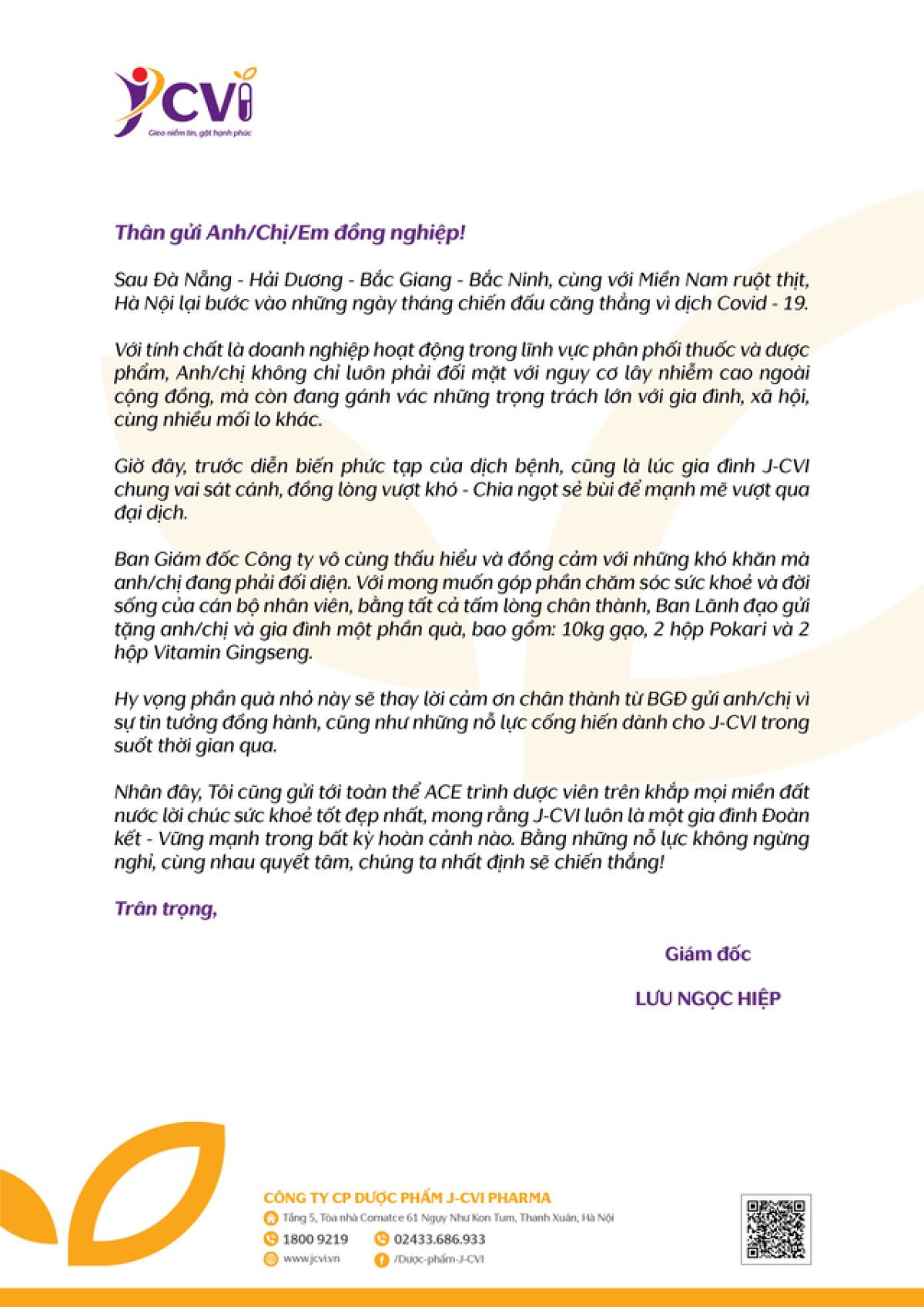 “Sau Đà Nẵng – Hải Dương – Bắc Giang – Bắc Ninh, cùng với Miền Nam ruột thịt, Hà Nội lại bước vào những ngày tháng chiến đấu căng thẳng vì dịch Covid – 19” – Ông Lưu Ngọc Hiệp – Giám đốc J-CVI Pharma đã mở đầu bức tâm thư động viên CBNV khu vực Hà Nội – nơi đang chịu ảnh hưởng bởi dịch bệnh trong tháng 7 và tháng 8/2021. Hoạt động trong lĩnh vực phân phối thuốc và dược phẩm, nên tập thể CBNV của J-CVI phần lớn là đội ngũ trình dược viên, luôn phải lưu thông trên đường phố để đảm bảo cung ứng hàng hóa thiết yếu một cách kịp thời nhất. Và họ cũng chính là nhóm người “luôn phải đối mặt với nguy cơ lây nhiễm cao ngoài cộng đồng, đồng thời gánh vác những trọng trách lớn với gia đình, xã hội, cùng nhiều mối lo khác”. Vì thế, trong bức tâm thư, Giám đốc Lưu Ngọc Hiệp chia sẻ: “Ban Giám đốc Công ty vô cùng thấu hiểu và đồng cảm với những khó khăn mà anh/chị đang phải đối diện….Giờ đây, trước diễn biến phức tạp của dịch bệnh, cũng là lúc gia đình J-CVI chung vai sát cánh, đồng lòng vượt khó – Chia ngọt sẻ bùi để mạnh mẽ vượt qua đại dịch”. Từ 15/7/2021, khi dịch bệnh diễn ra căng thẳng, ở J-CVI đã bắt đầu thực hiện làm việc luân phiên online, với mong muốn góp phần chăm sóc sức khoẻ và đời sống của cán bộ nhân viên khu vực Hà Nội, không chỉ gửi tâm thư, mà đại diện BGĐ là ông Lưu Ngọc Hiệp – Giám đốc và ông Nguyễn Hồng Nam – Phó Giám đốc công ty còn đến tận gia đình trình dược viên trao tặng 1 suất quà gồm nhiều hàng hóa thiết yếu như: 10kg gạo, 2 hộp Pokari và 2 hộp Vitamin Gingseng. Qua đây, ông Hiêp cũng gửi gắm lời chúc sức khỏe tới toàn thể CBNV trên cả nước và hy vọng rằng J-CVI luôn là một gia đình Đoàn kết – Vững mạnh trong bất kỳ hoàn cảnh nào. Ông nhấn mạnh: “Bằng những nỗ lực không ngừng nghỉ, cùng nhau quyết tâm, chúng ta nhất định sẽ chiến thắng!”