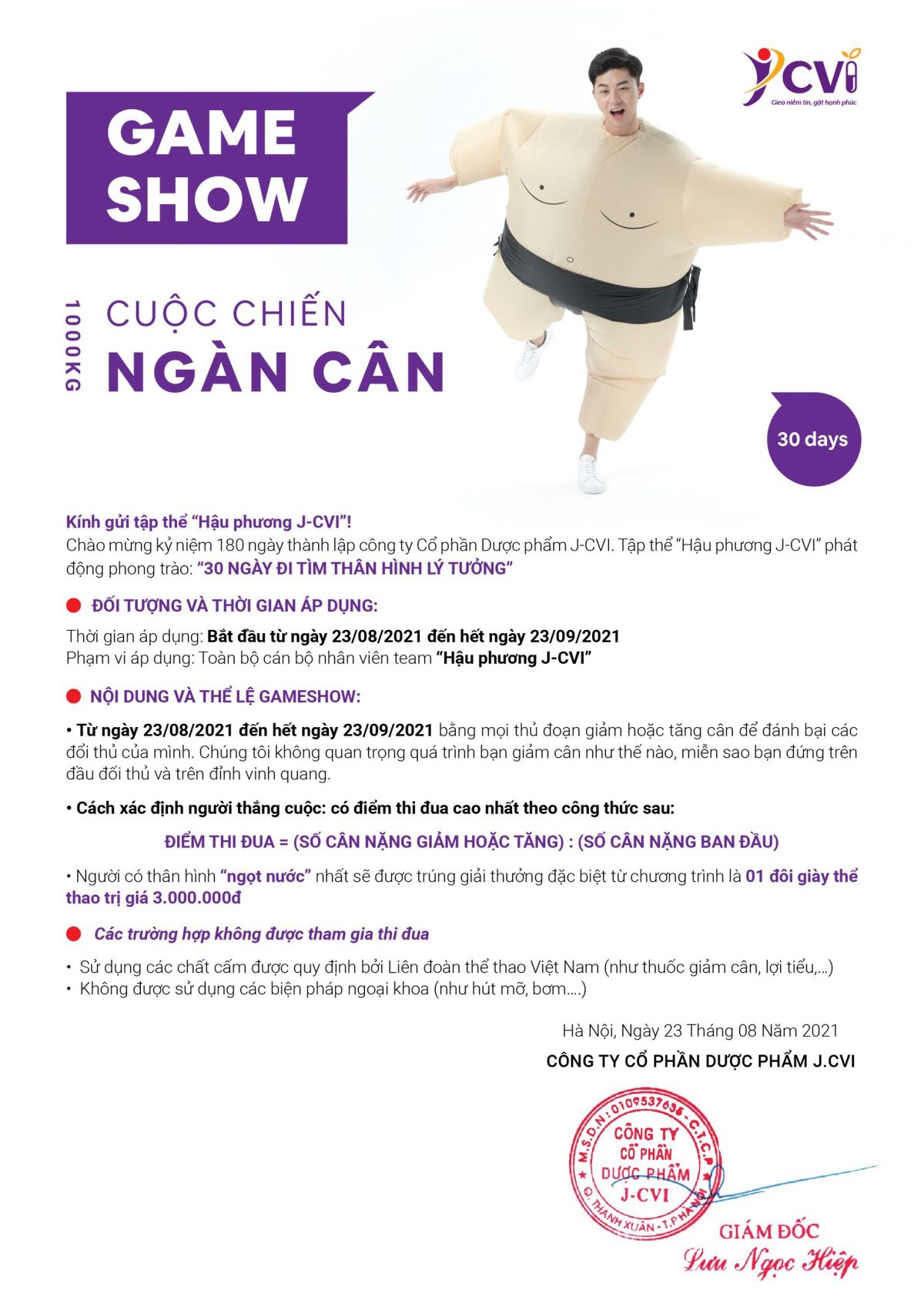 Vừa rèn luyện sức khoẻ, vừa tạo không khí thi đua phấn khởi để CBNV yên tâm làm việc luân phiên trong bối cảnh dịch bệnh, Công ty CP Dược phẩm J-CVI chính thức khởi động phong trào “30 ngày đi tìm thân hình lý tưởng” với Game show “Cuộc chiến ngàn cân”.
